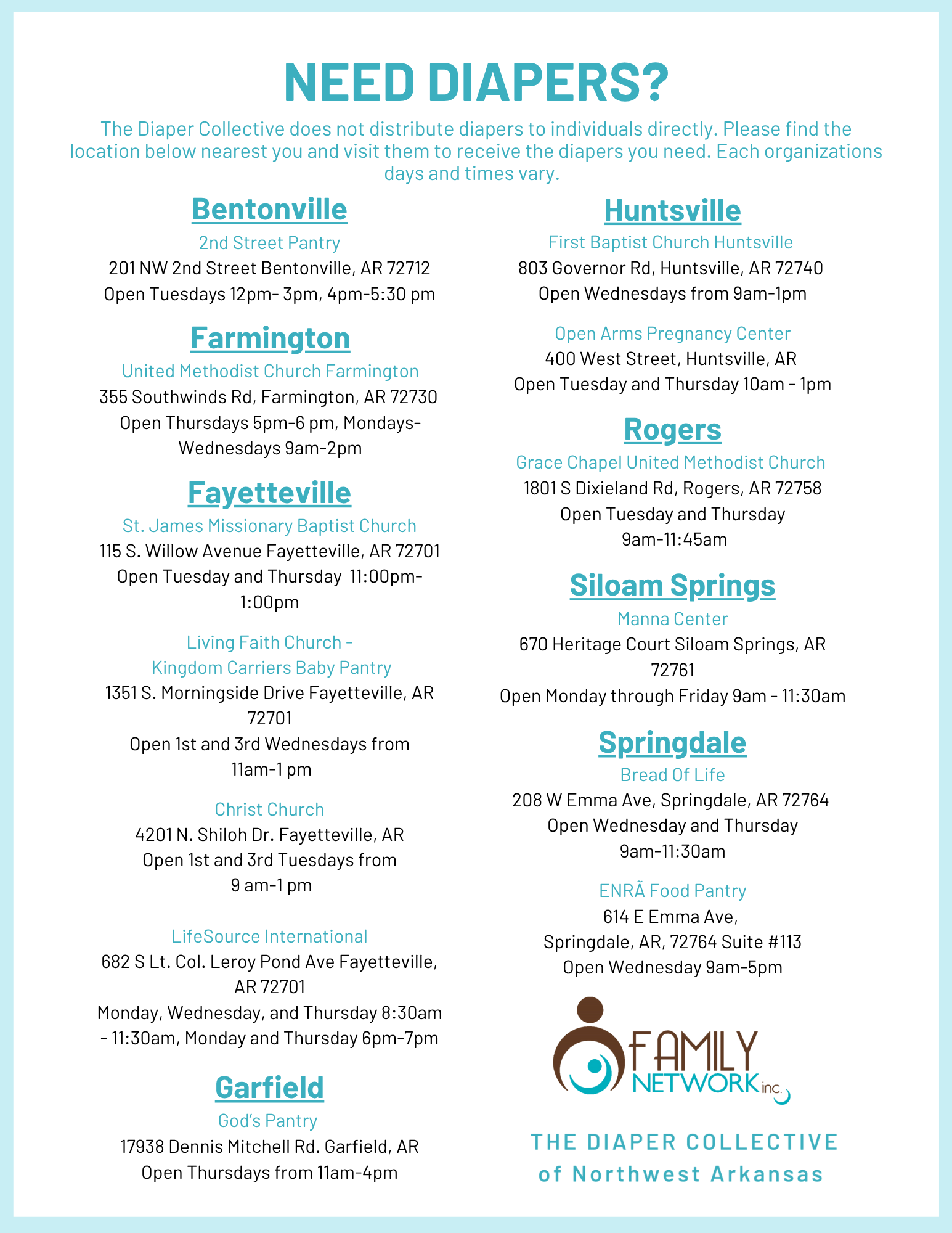 At The Diaper Collective, we distribute diapers through our partner agencies. These are programs in the Northwest Arkansas community that are already serving children and families.